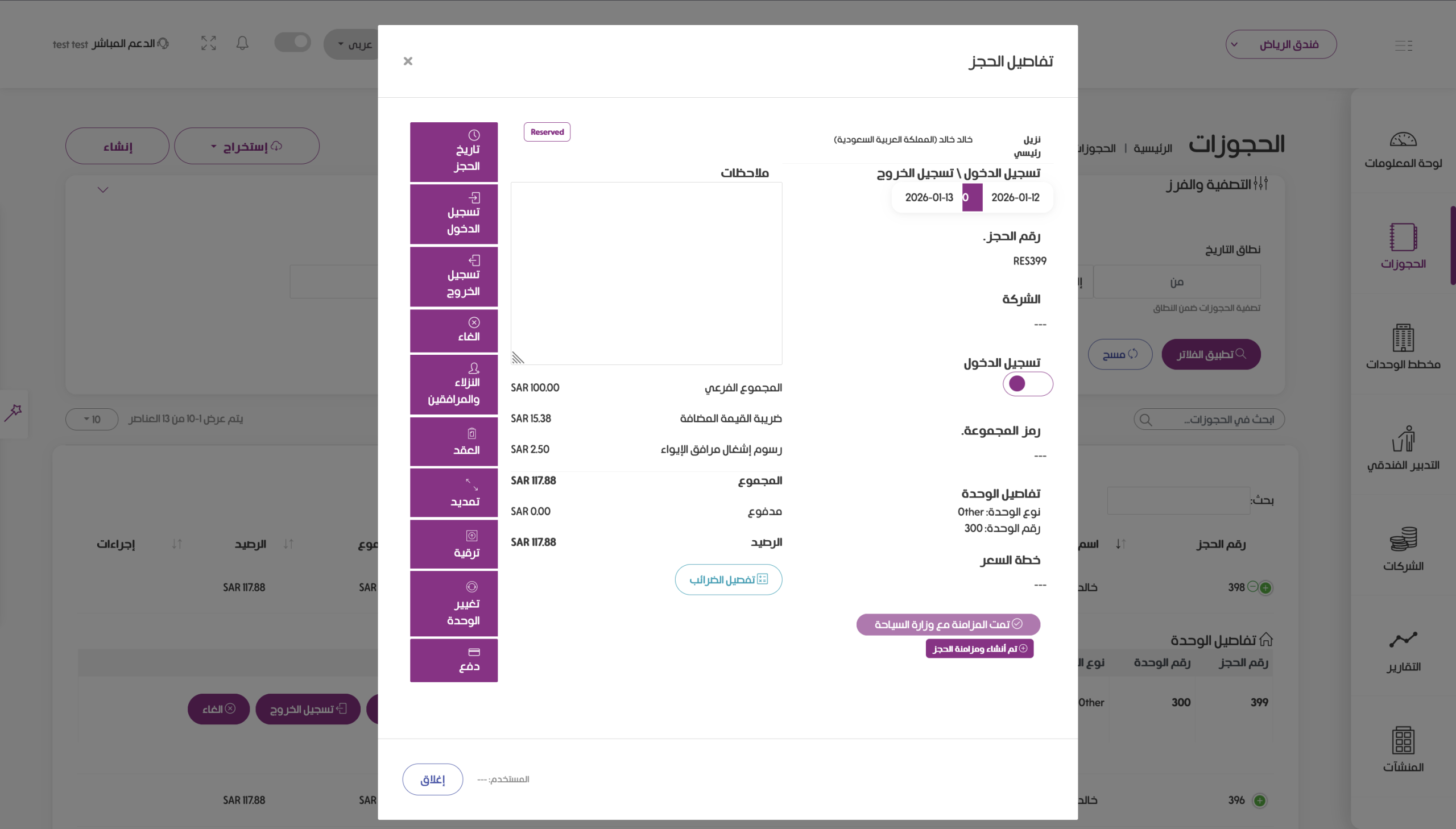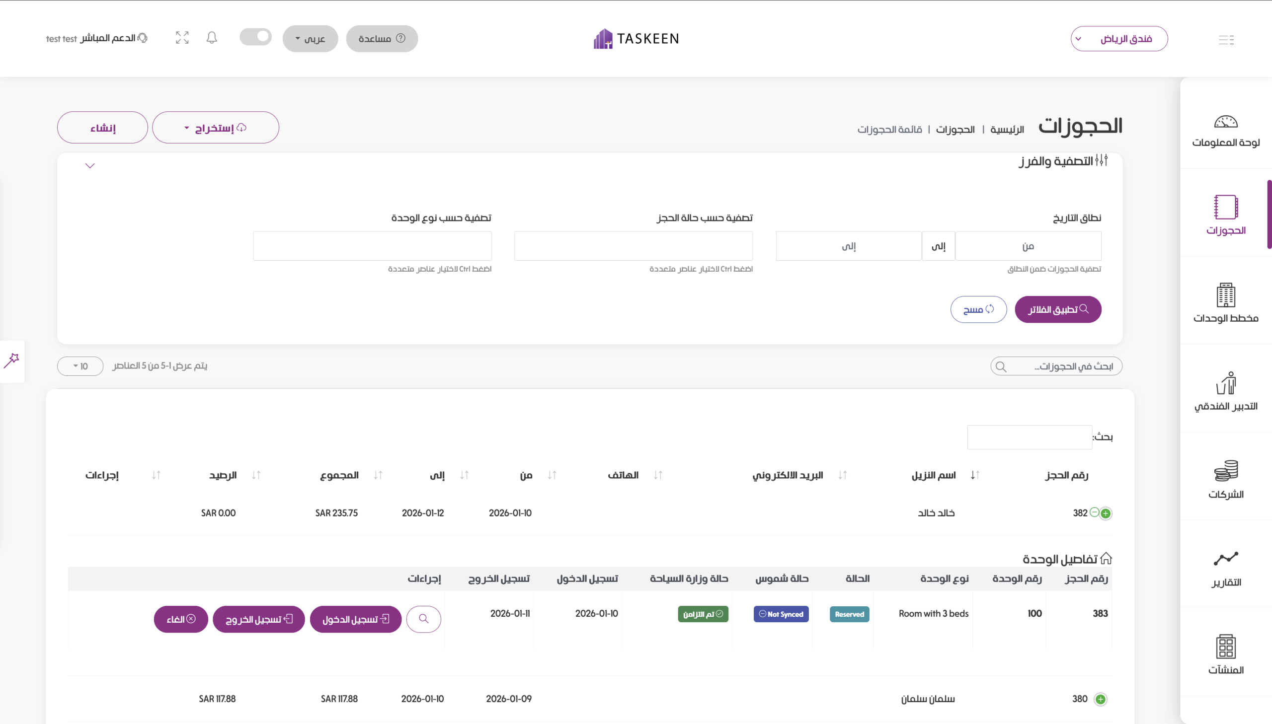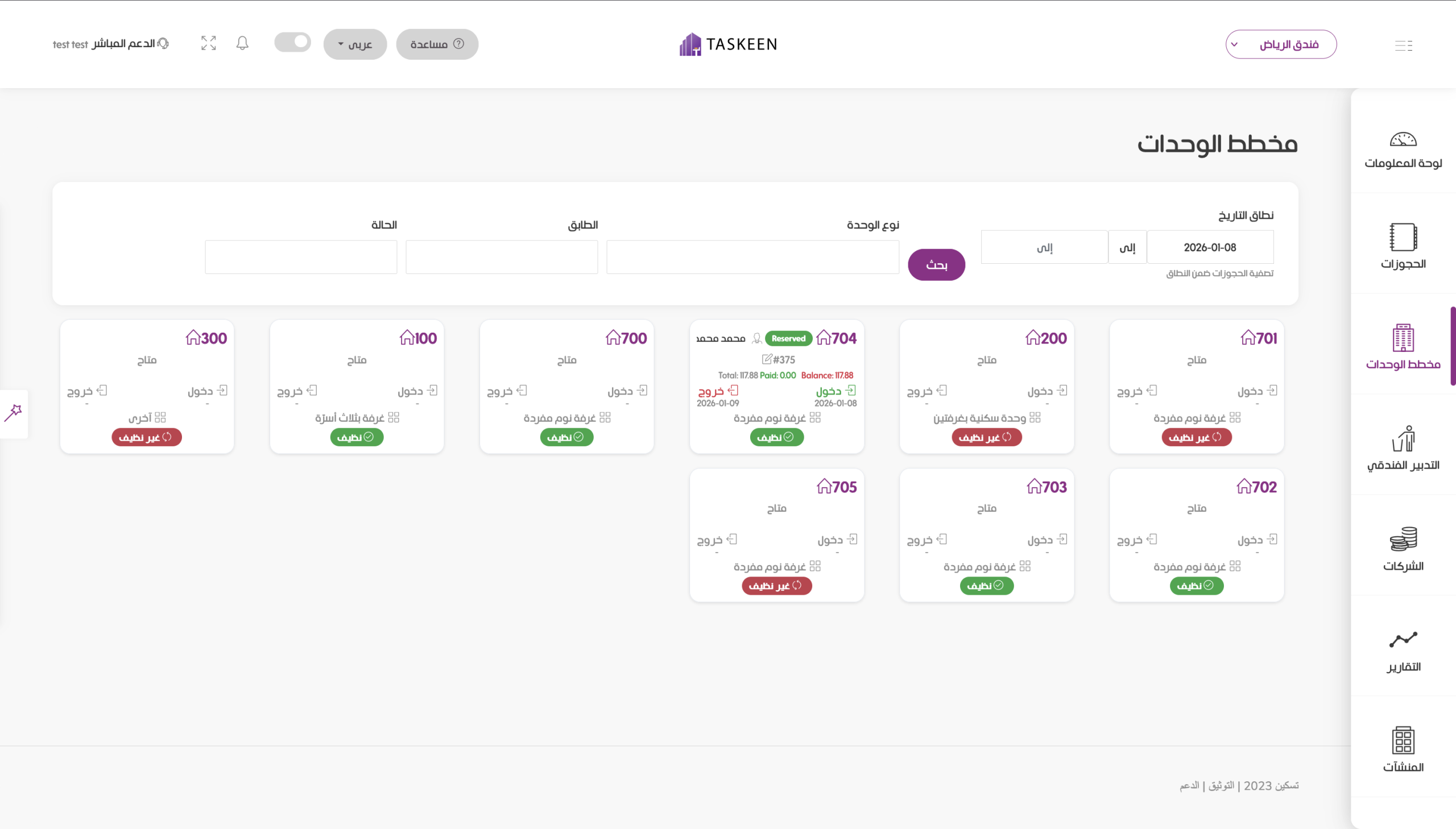 بإمكانك الربط مع وزارة السياحة ومزامنة الحجوزات تلقائياً وتنظيم شامل لحجوزات الأفراد والمجموعات. يساعدك تسكين في إعداد النطام بخطوات بسيطة وتشمل إعداد المباني والطوابق والغرف بطريقة منظمة. مع إمكانية إدارة عدة منشآت من حساب واحد لمتابعة التدبير الفندقي وطلبات التنظيف والصيانة ومراقبة الأداء. يوفر النظام واجهات سهلة لإنشاء وتمديد الحجوزات ومتابعتها وتحصيل المبالغ وطباعة الإيصالات والعقود ويوفر أدوات إدخال البيانات آليا عبر الأجهزة الذكية لإدخال بيانات النزيل بدون كتابتها. يمكنك أيضاً إضافة المرافقين للحجز في أي وقت وتعديل البينات. يوفر النظام آلية سهلة لإضافة الأسعار وتعديلها حسب الحاجة.